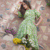 - This dress features a round neckline, short puff sleeves, and a fitted waist that flows into a tiered midi skirt.
